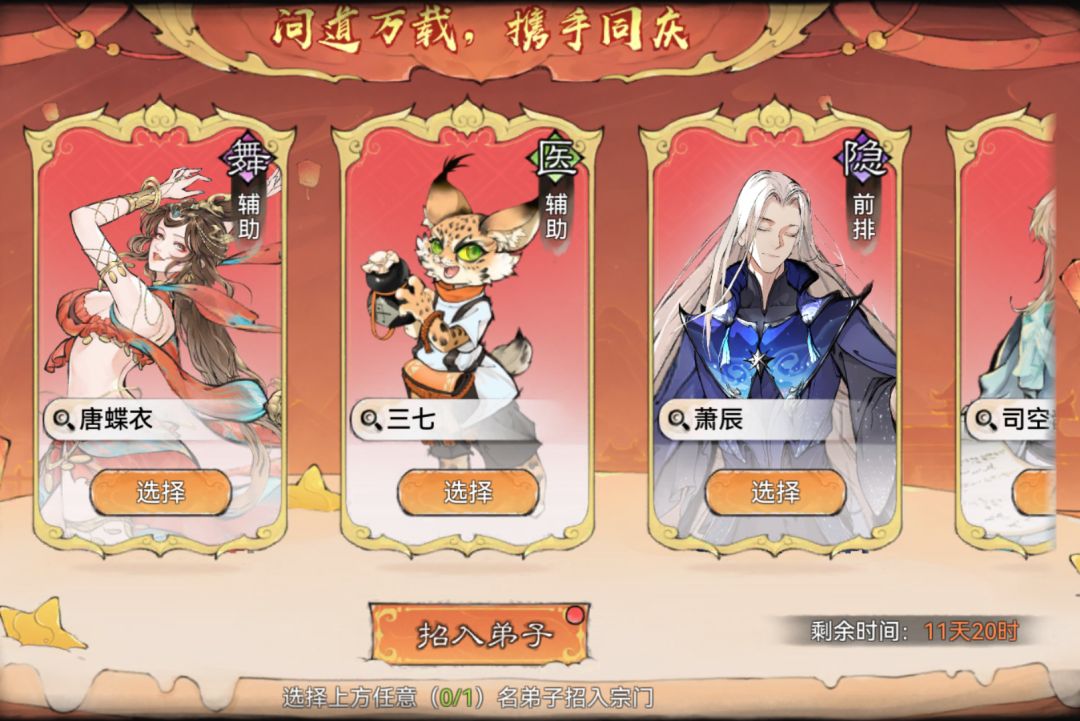 活动期间,可从李清圣、秦冰、唐蝶衣、三七、萧辰、司空韶华、云瑶、白千儿、银无月这9名弟子中选择1位免费招入宗门。