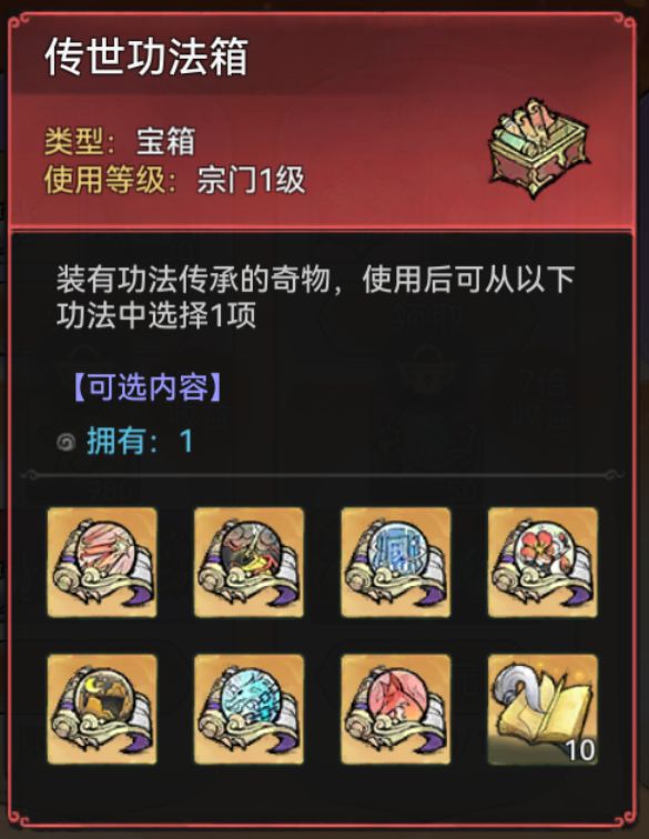 仙缘寻访次数达到500次可领取【传世功法箱】,可从煞刑战帖全篇、囚龙战典全篇等功法中自选1项。
