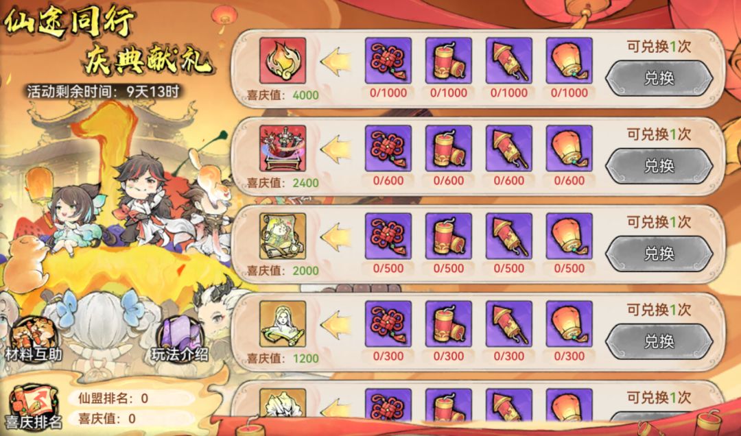在兑换道具的同时,祖师还会获得一定的喜庆值。喜庆值会以仙盟为单位进行累计排名,排名靠前还可获得五行登仙令、四阶物资箱等奖励。