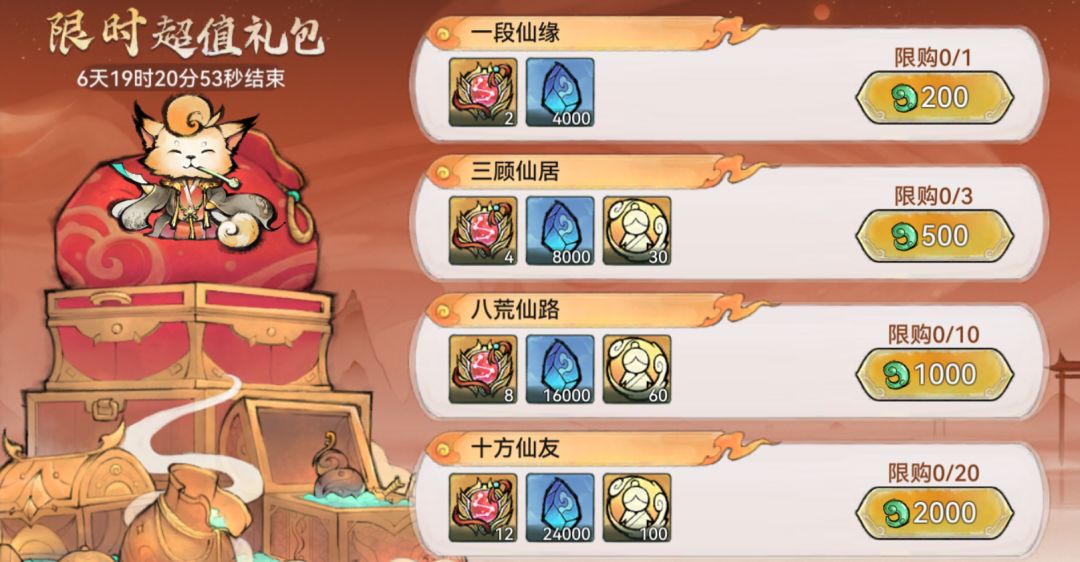 除消耗寻仙令外,祖师也可以购买限时礼包和灵玉礼包来获取仙缘值。