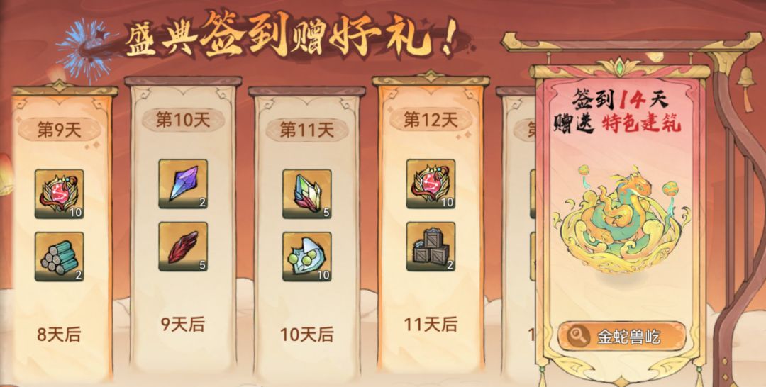完成登录签到即可获得寻仙令*50,以及“金蛇兽屹”景观、限定头像框等奖励。