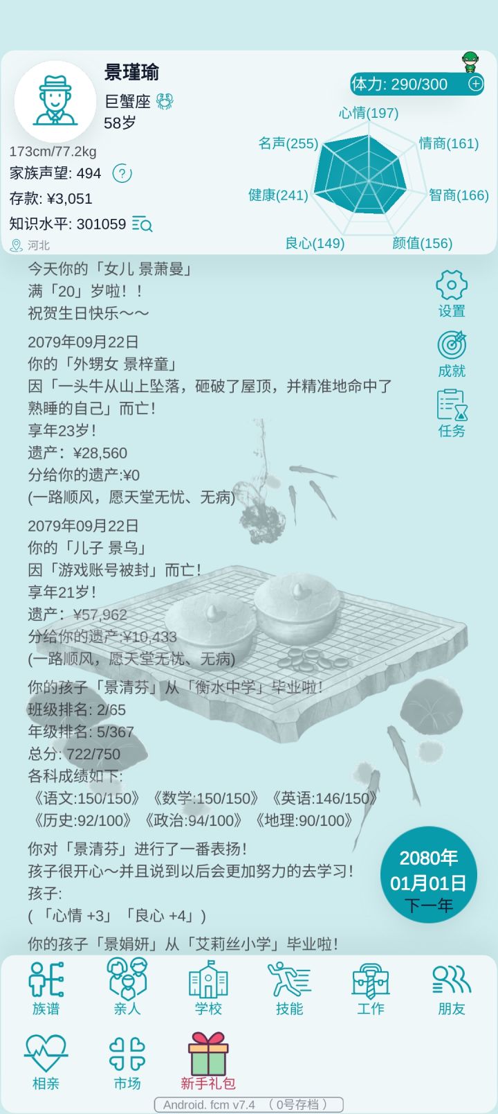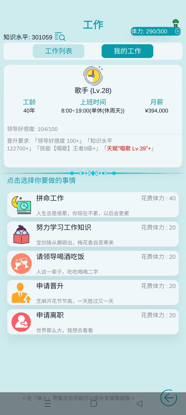 今天睡不着觉,就玩了个新档,我自己6岁发现有36级唱歌天赋,所以就高中毕业直接去当歌手,30岁前工作等级看广告肝到28级,月薪40万。感觉自己可以了,就娶了老婆,然后生了7个孩子。