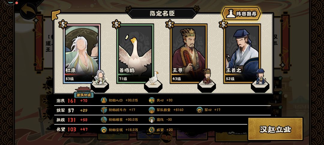 杜康/荀彧开局点出两个陶瓷;善鸣鹅+王羲之开局点出两个墨宝,就能开局在政治政策里点出团结度+20,再加上王导给的10点团结度,就可以达到100。