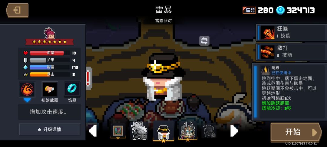 技能包括无敌,位移,消除子弹和概率眩晕的效果,并且是可储存的技能。