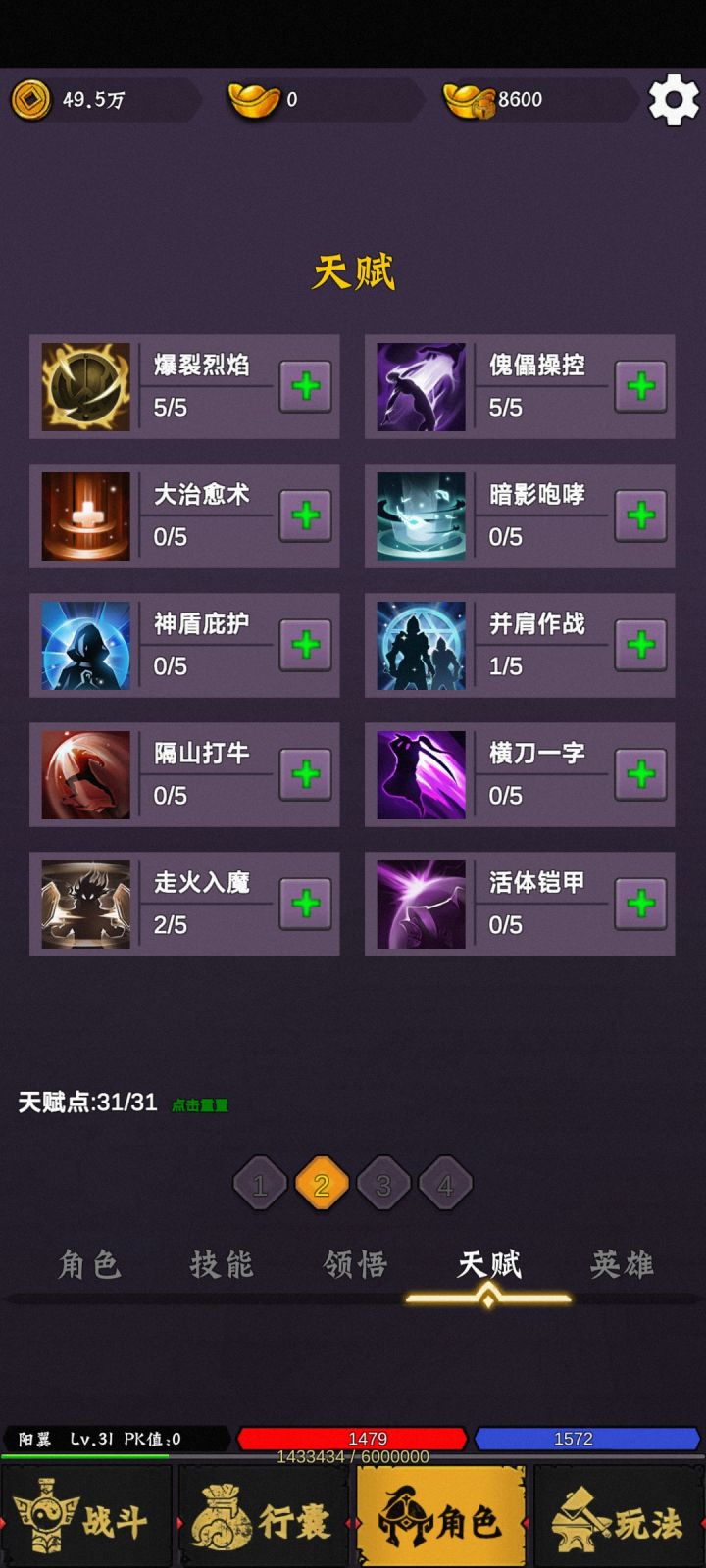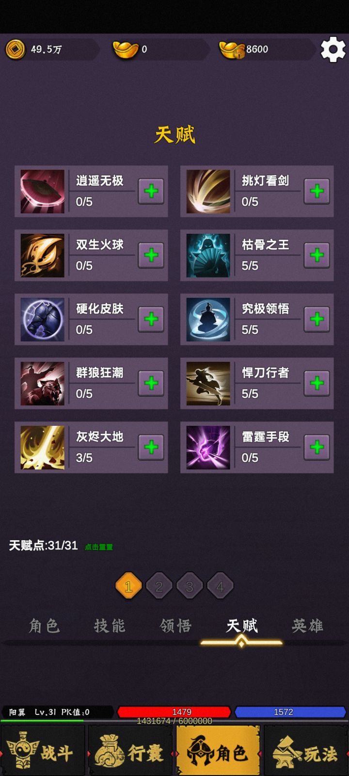 sgcq,fuli20然后穿上新手装备砍鸡到9级,一定要组队挂机。这样有经验加层。9级可以解锁危险地图,手动刷下第2张图里的boss爆点装备。这样挂机到18级学会骷髅,再回1图危险区打满1万只鸡成就,奖励50%经验加成。开局天赋重置未转生前是一天免费一次,转生后怕1-5转一周免费一次,5转以上每月免费一次。 对了还有每天的广告也要尽量看完可以得点蚊子腿这东西零氪必看资源都是一点点累积起来的而且看广告得的声望可以换东西也可以省点。31开的家园你们的建筑多多升级可以得到一些yb资源零氪必须的。角色里面金条也别换钱,金条给戒指打孔。尽量打一个加攻击的戒指,这样打开新图容易过。邮件消息里到等级会送道具还有解锁什么功能介绍,到等级该加天赋属性。27级打过蜈蚣目前就追上大部队了。35级开启转生,穿好35级装备再转,不转不能继续升级。祝福油初期上到幸运3就行。等有高级点的武器在上到9,低级油加到4后用超级油升到9。 上面是我的天赋图。做个参考 反正每天可以重置一次自己试错。