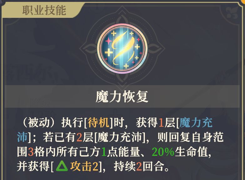 此外,在满配情况下,被动技能“魔力恢复”也完全不需要携带。一方面是因为五星玛露西尔[待机]时本身就会回复2层魔力,被动额外给的1层魔力会溢出;另一方面是因为即使“魔力恢复”未正常生效的bug被修复,后半句“若已有2层[魔力充沛],则回能、回血、加攻2”的判断时点仍然是在个性/被动的魔力回复之前,也就是说必须保证玛露西尔本次行动不使用任何[职业技能]才能触发此效果,非常鸡肋。