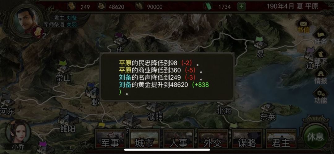 同样三万粮草下去,河东加了整整40点民忠,长安才25点,差不多一半(5W差不多是3W的一倍左右)民忠80之后被流言的几率就很小了,90~100基本没有流言,所以萌新们进攻之前最好存够3~5W的余粮(不包括你还要出征消耗的粮草哦)