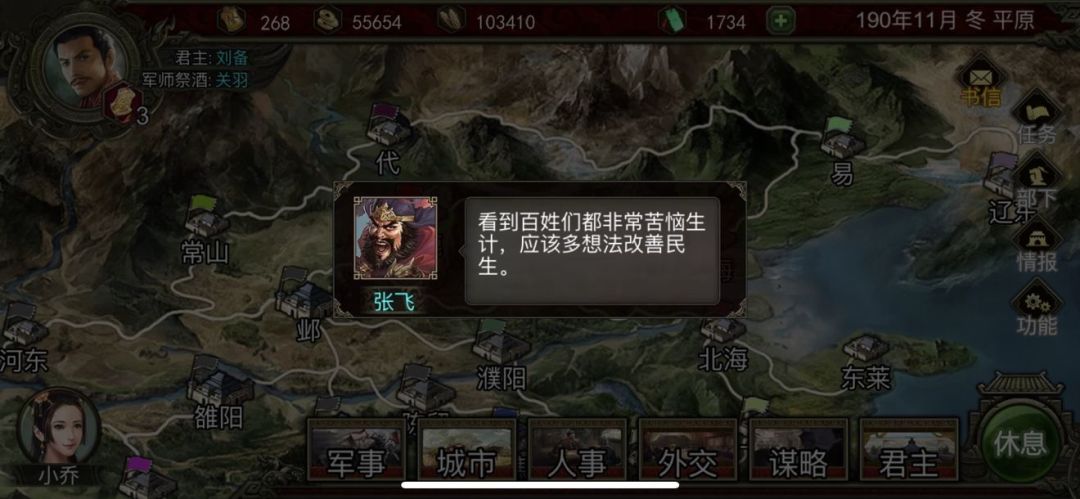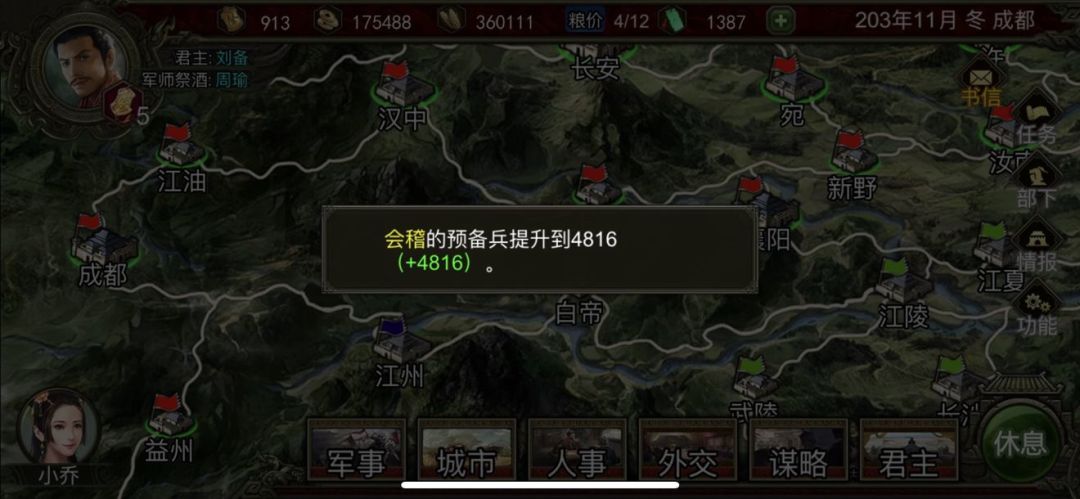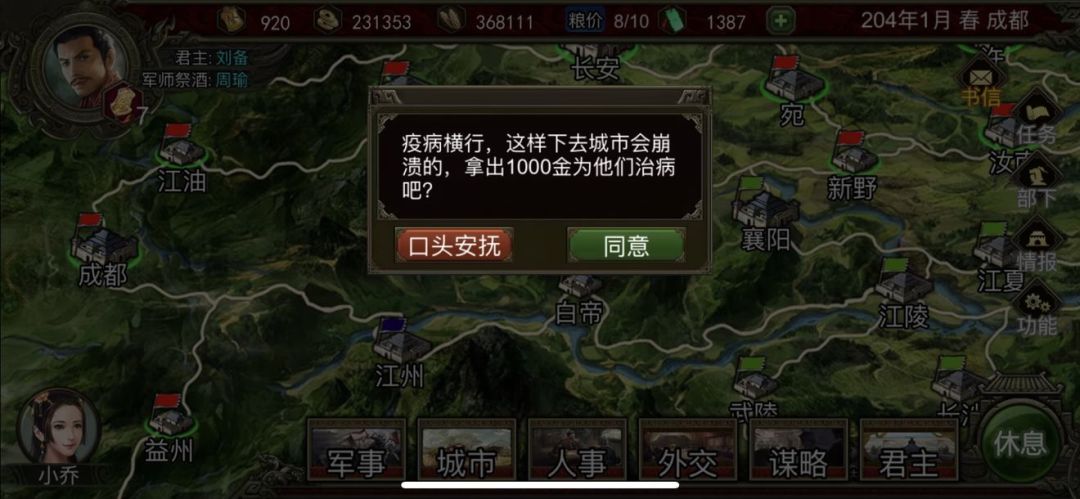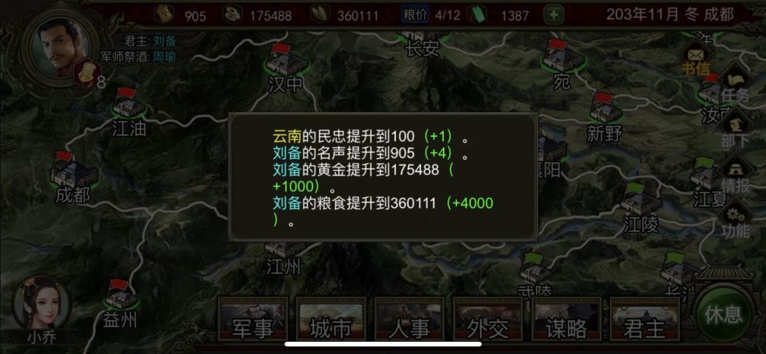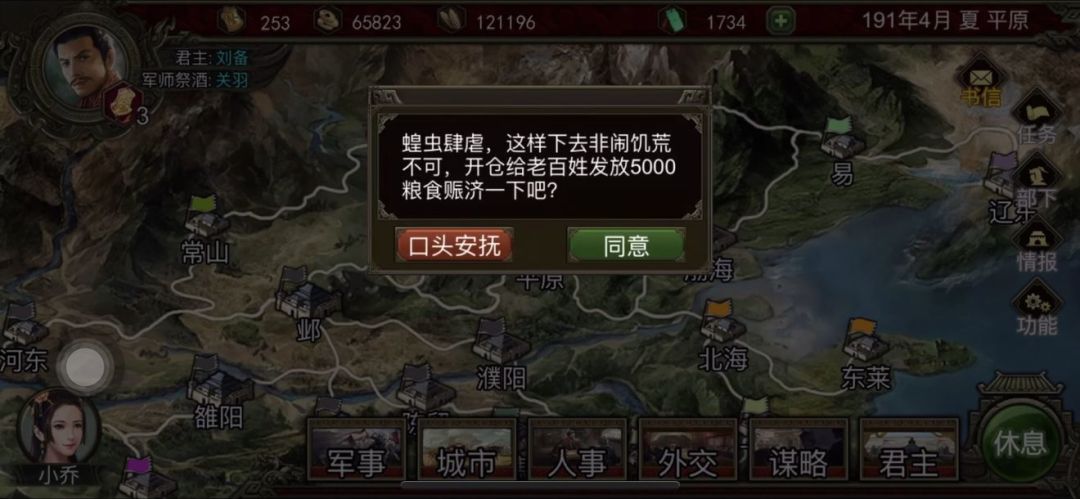 下面给大家贴图详细讲解一下,各种事件以及奖励(目前我触发过的就这么多,欢迎大佬们添加)一、粮草换民忠首先民忠低于60,城内有招抚技能的武将必定触发(bug除外),60以上随机触发,貌似越高概率越小;三个选项,1W 3W 5W
