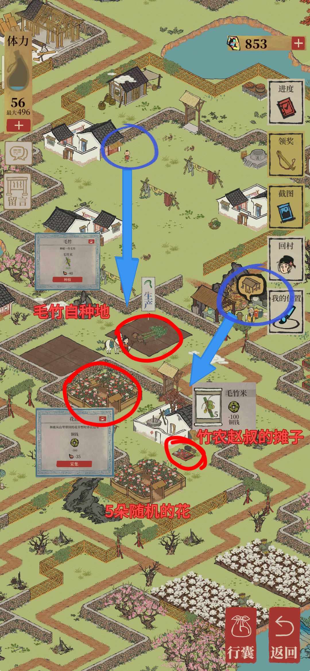 毛竹:地图中右部偏下,可以以地图上的两个小人儿:①大宝②脑袋上有建筑标志物的老道士为参照,寻找这块儿地
