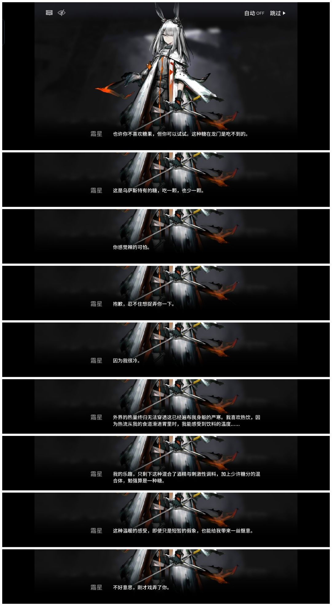 出自明日方舟主线剧情6-13,博士和霜星被困在某处废墟下暂时不能离开时霜星和博士聊天的内容,因为霜星的源石感染很深,她的特殊源石技艺给予她创造寒冷的能力,这种能力光是被动的情况下就已经透出惊人的寒冷,因此她几乎全部的感官知觉都已经丧失,大概只剩下“冷热”和“疼痛”的感知。