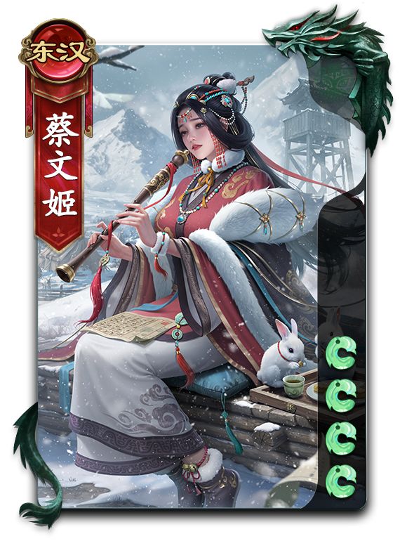东汉末年女性文学家。蔡文姬博学多才,擅长文学、音乐、书法。早期嫁给卫仲道,夫亡后归宁。东汉末年,南匈奴叛乱,蔡文姬为左贤王所掳,在匈奴生育两个孩子。曹操统一北方后,念及蔡邕没有子嗣,花费重金赎回蔡文姬,嫁给董祀。而后董祀犯死罪,蔡文姬去找曹操给董祀求情,使夫君被赦免。又将自己所记古籍写下来送给曹操。