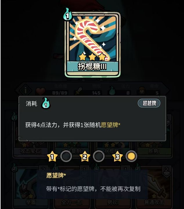总结:比较方便新手爬塔的角色,角斗、时空之门、遗迹BOSS战几乎看不到。使用时要注意以下2点。一是使用圣诞这个角色,拿“魔法面具”时就得注意点了,因为不少4费卡,升级了就降低消耗了,没法触发“魔法面具”。第二是注意别拿任务“牛脾气”,“拐棍糖”获取的“愿望牌”属于临时牌,有“牛脾气”时,使用是会扣血的,而且会污染你的卡组。