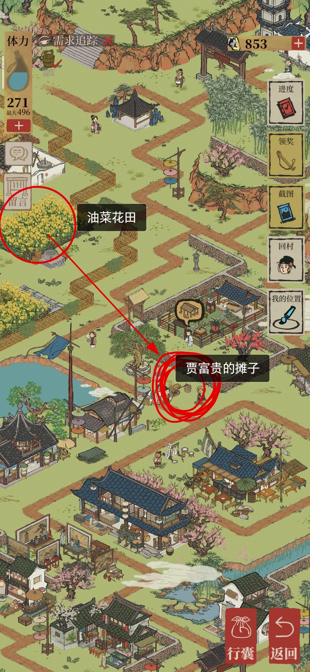 贾富贵的摊子:地图中右部偏上,油菜花田附近