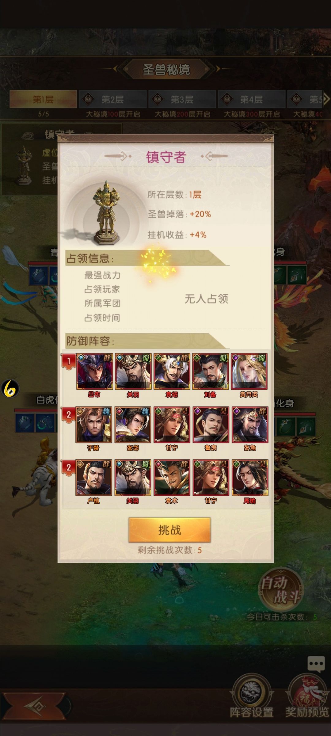 击杀圣兽不是必定获取首饰装备,主公可以通过击败镇守者来增加掉落几率,但需要三只队伍都通过才算击败镇守者,击败镇守者之后还能提升大秘境的挂机收益,所在的圣兽秘境层数越高,提供的收益比例也就越高,