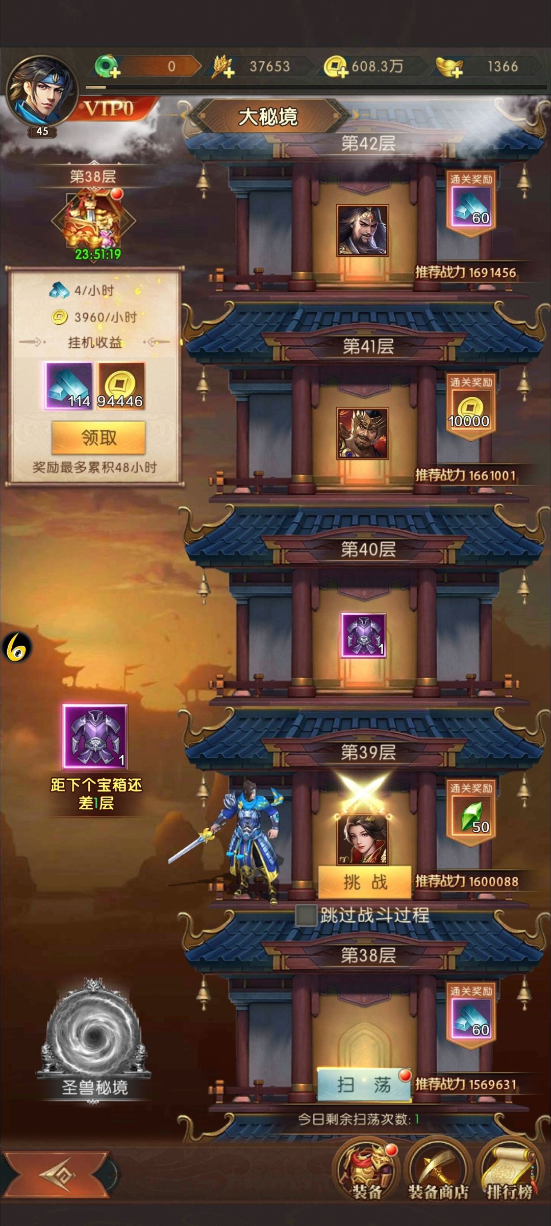 二、扫荡与挂机奖励主公在通关爬塔15层后,可以解锁扫荡,主公可以扫荡已通关的层数获得一定的奖励,每日首次扫荡免费同样也是层数越高,扫荡获得的奖励越多,挂机资源获取在大秘境通关30层之后才开放,主公可以在挂机中获取一定数量的精铁和铜币,每次挂机资源最多累积48小时,主公记得及时获取,以防资源溢出浪费。