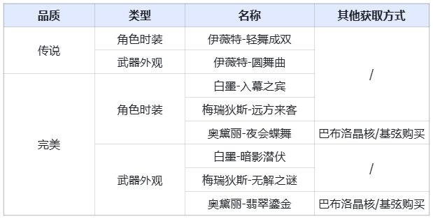 例:引航者在2024年6月3日开启的「意识重构-轻舞成双」中只获得了幻霜武器外观「圆舞曲」,其在2025年3月13日复刻的「意识重构-轻舞成双」中首次获得传说品质时装/外观时,将必定获得伊薇特角色时装「轻舞成双」。