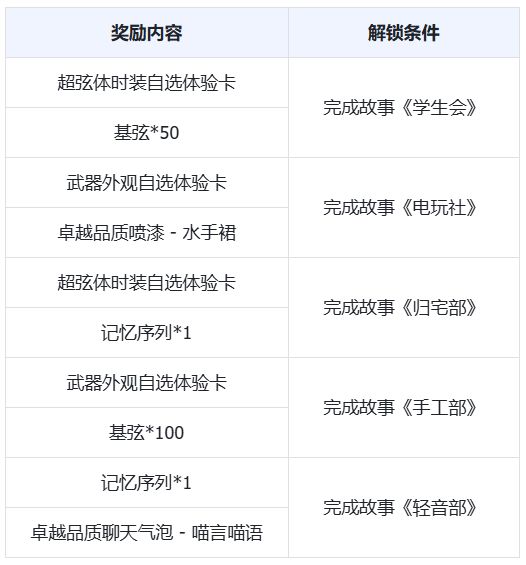 - 解锁全部故事后,【学园集市】将解锁,引航者可以使用「春樱印章」兑换基弦奖励。