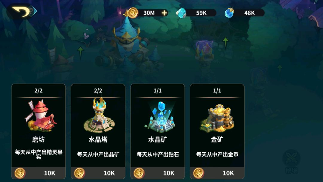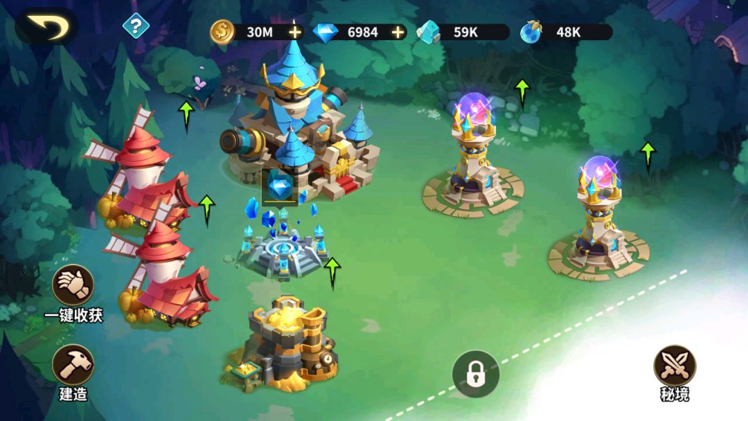 天选者等级达到40级时,开启仙境玩法。可以在仙境中建造不同类型的建筑,建筑的建造条件以及数量和堡垒的等级有关。生产类的建筑有磨坊、晶矿工坊、炼金工坊、钻石工坊,产出对应的精灵果实、晶矿、金币、钻石,可以升级提高产量,磨坊、晶矿工坊最多可以建造3座。建筑拆除后资源不会返还。