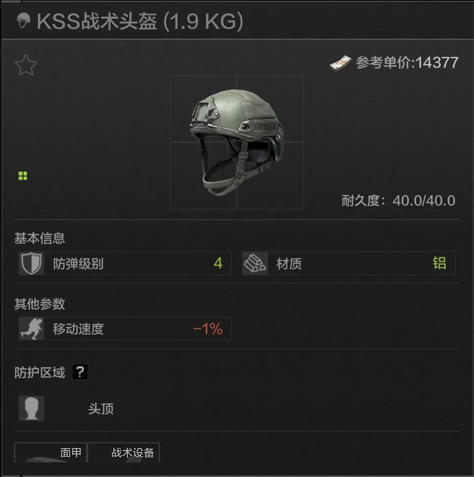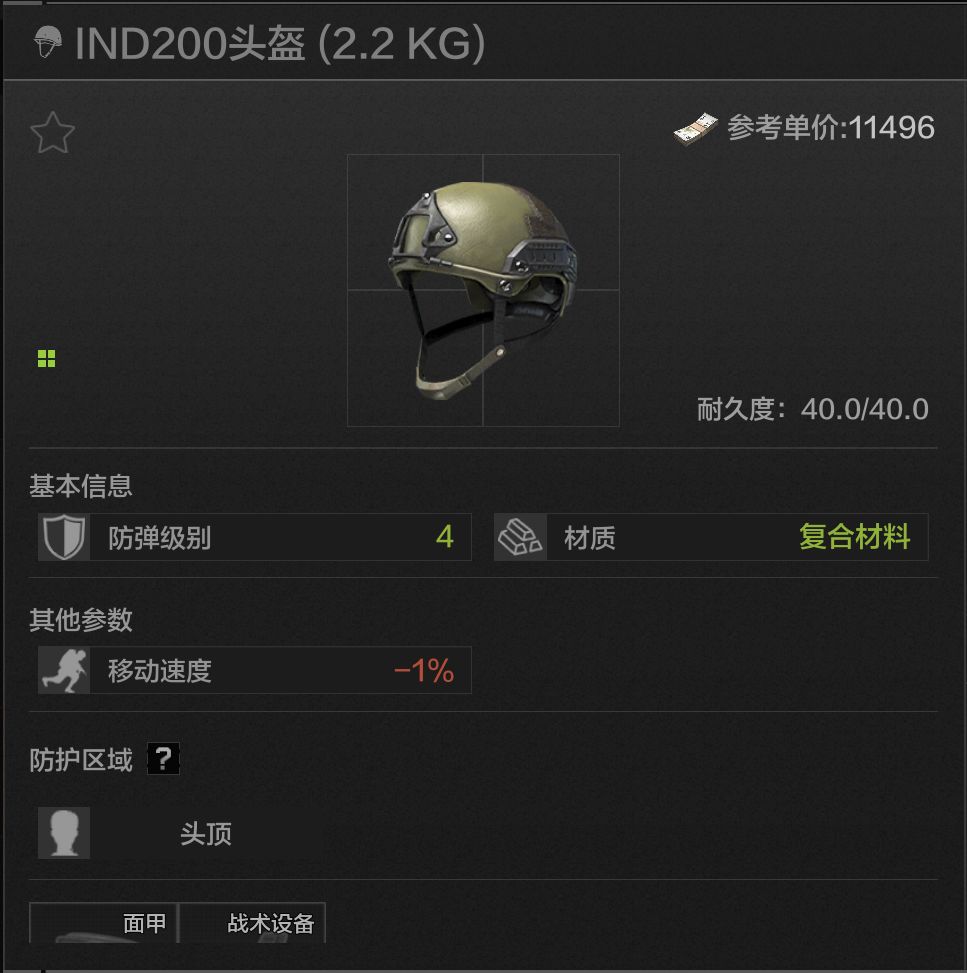 40耐久,头顶防护,除去耐久度以外全部属性与IND战术相同,最高加装三级面罩,价格很低,是比较经济实惠的四级头。