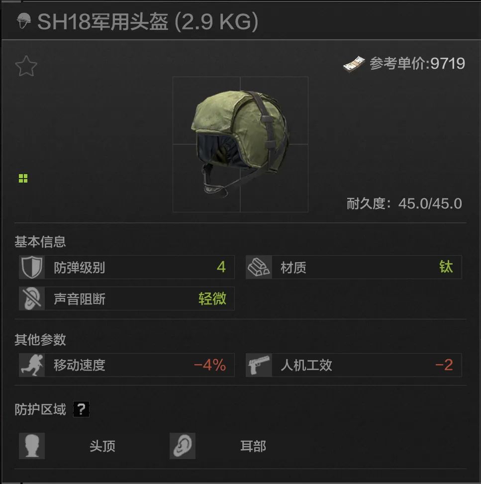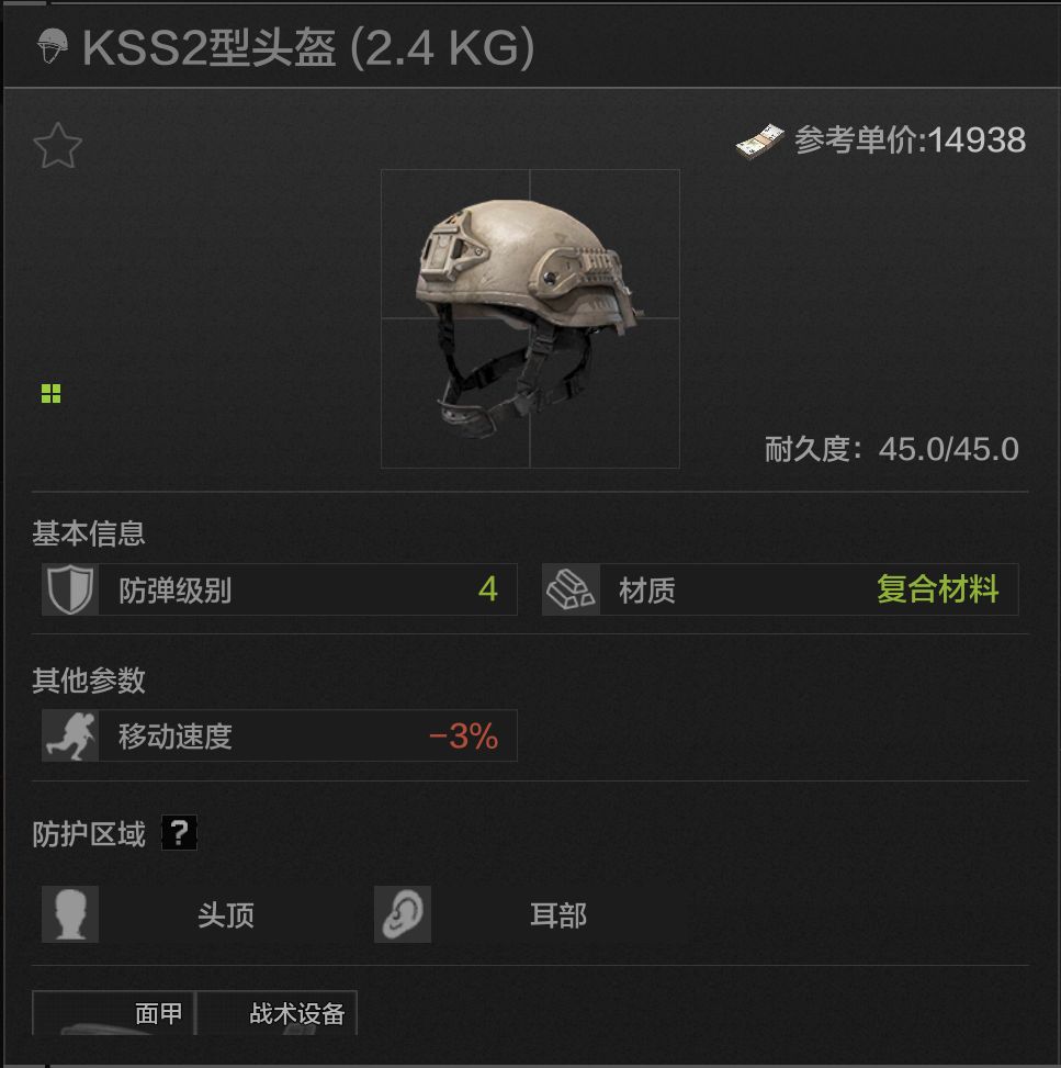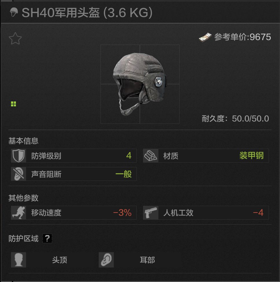50耐久,头顶耳部防护,四级头当中最硬的头盔,材料是高贵的装甲钢,加装面罩可以达成头部四级全防,但问题在于会有一般等级的声音阻断,同时debuff较高,而且硬归硬,但再硬它也只是个四级头。