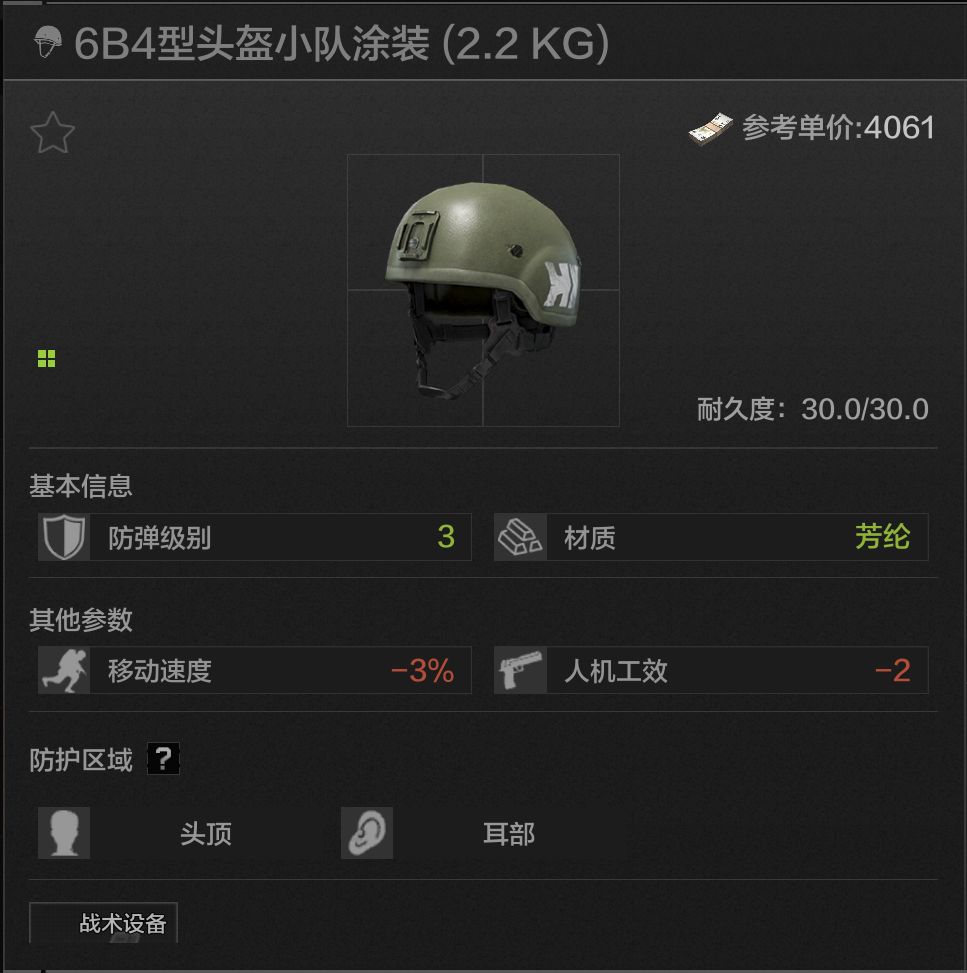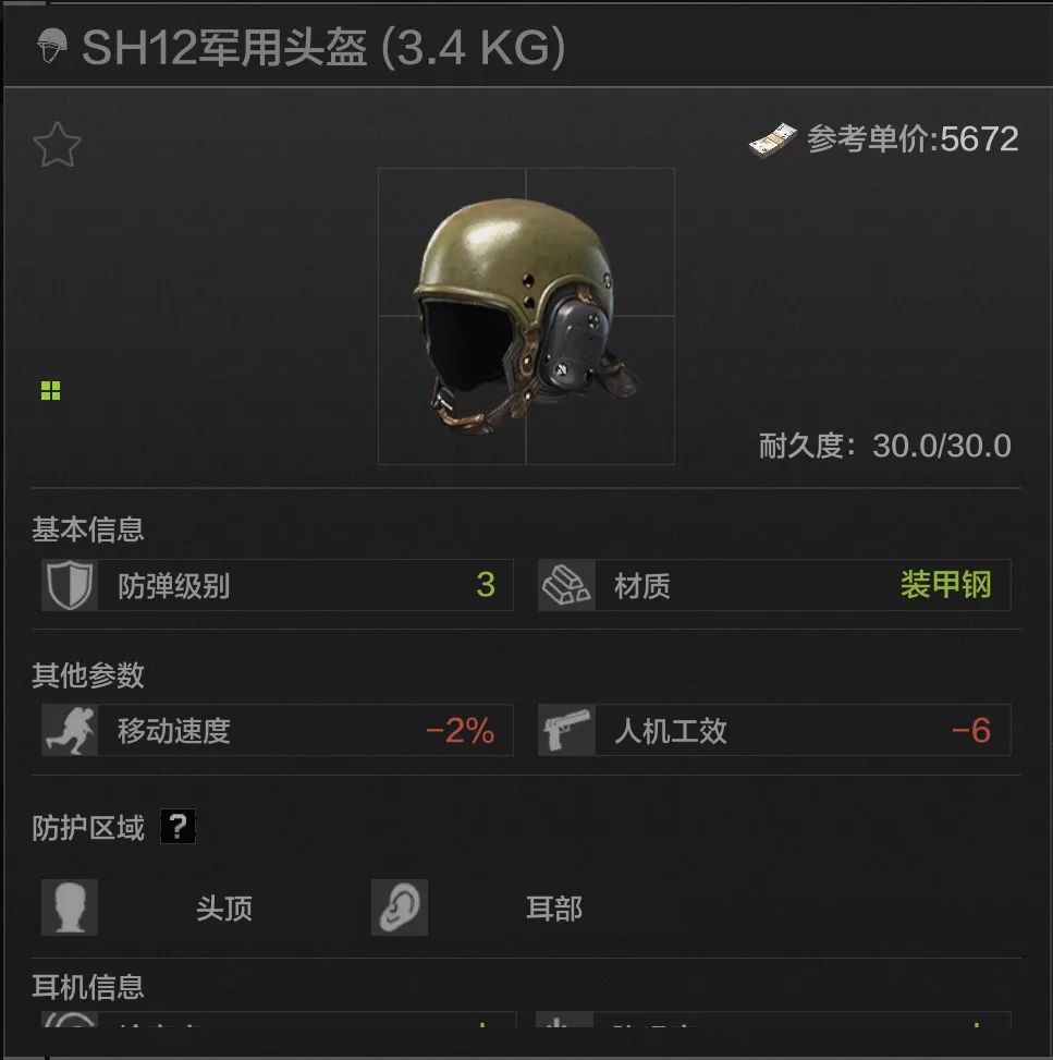 30耐久,头部耳部防护,唯一真神!材料是高贵的装甲钢不说,还有比肩Z038耳机的拾音和降噪能力,带上一个防毒面具能直接勇闯任何地图,唯一的问题是人机功效扣除太高,但瑕不掩瑜,debuff不多点这头就无敌了,非常推荐,直接登顶暗区必吃榜榜首!