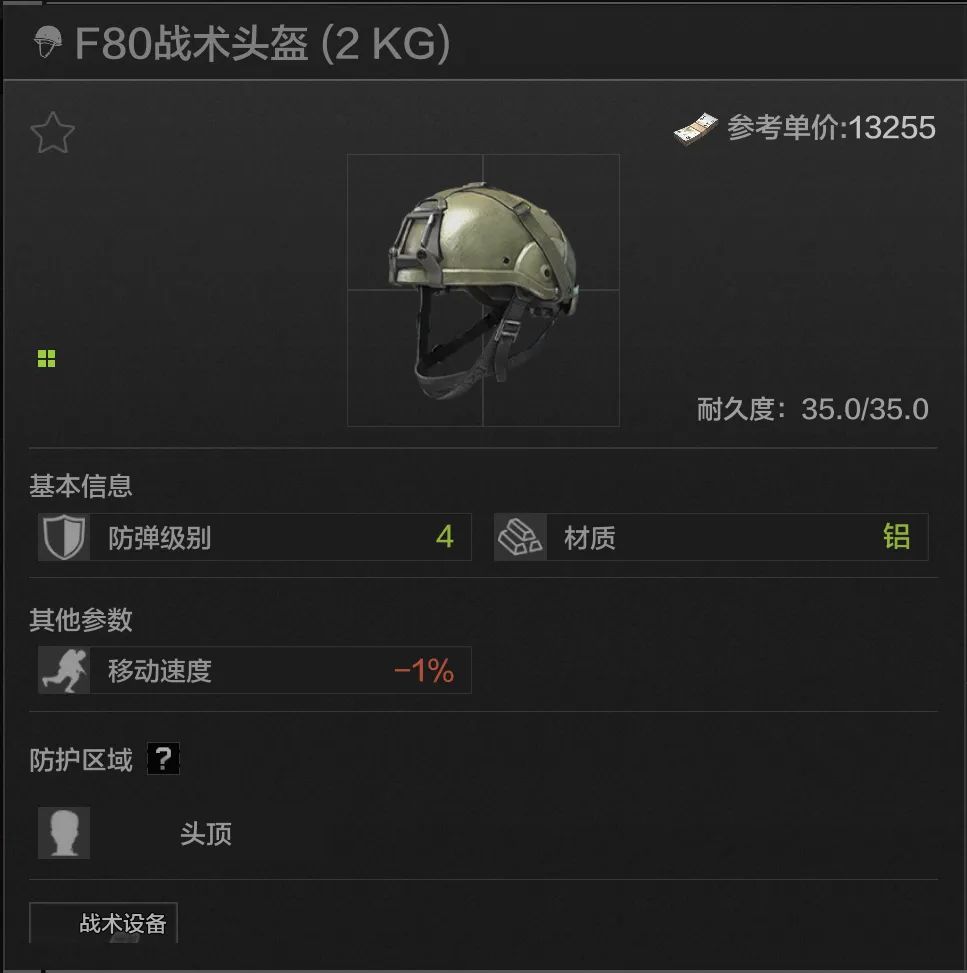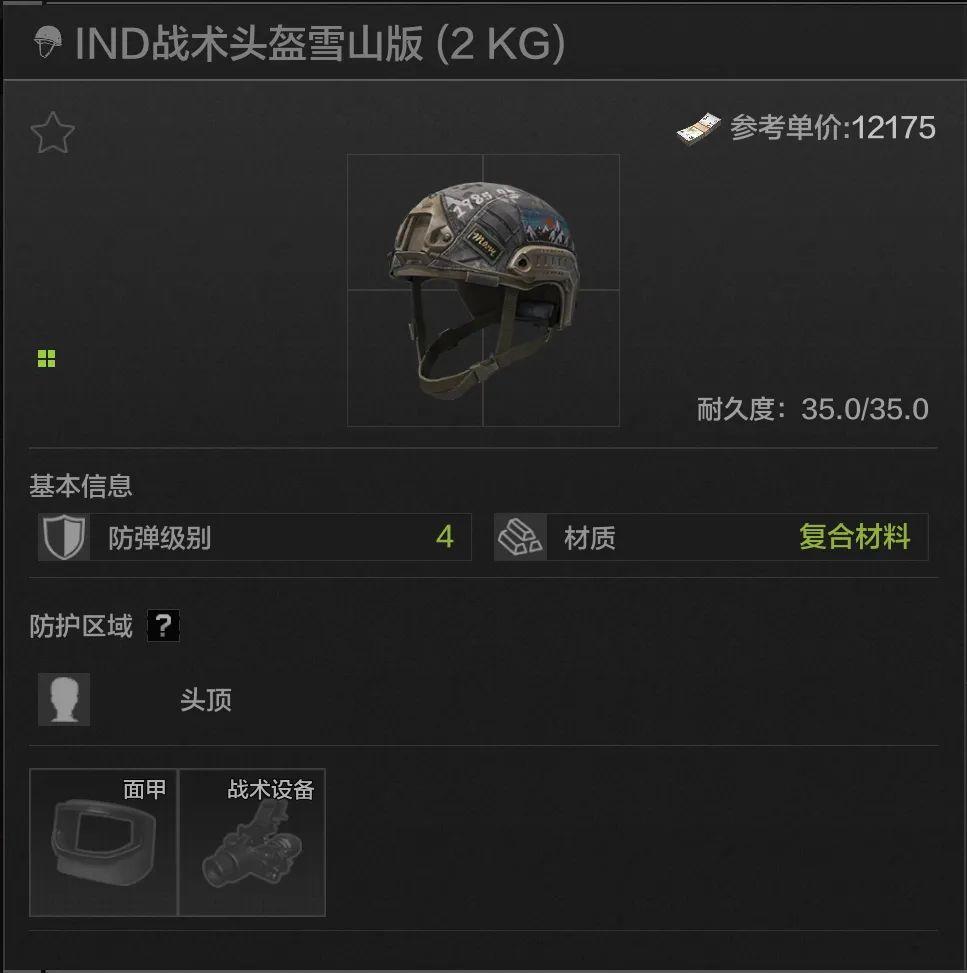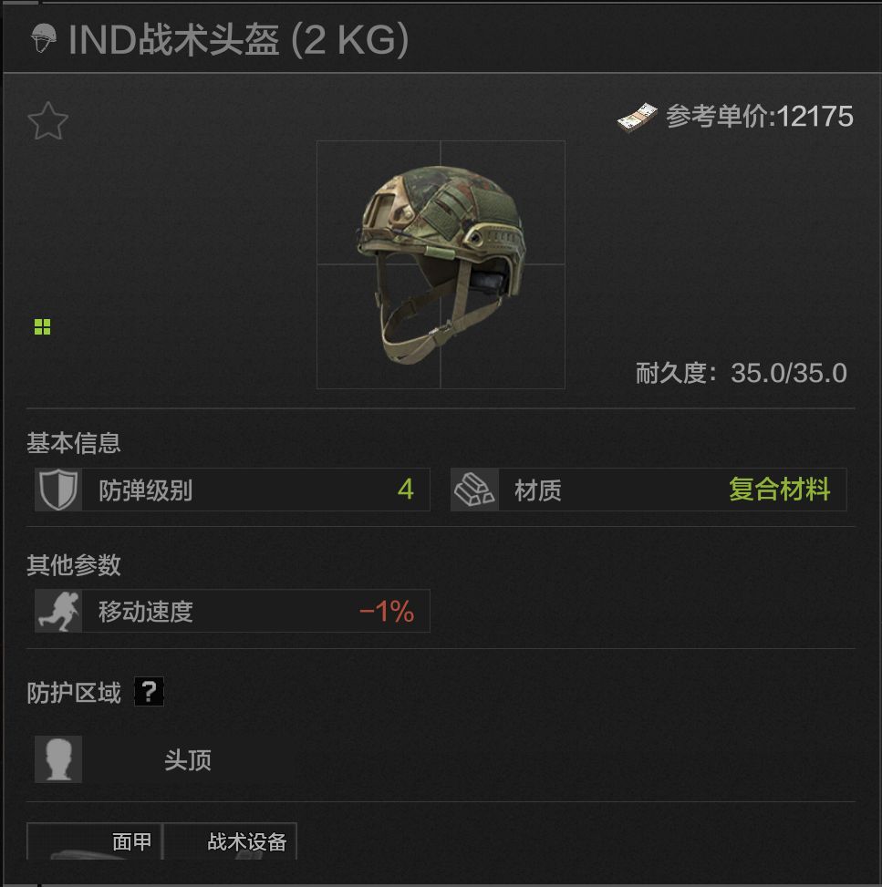 35耐久,头顶防护,IND战术的皮肤版,可以从弗雷德那里借来用,完全没有debuff扣除,性能可以但价格不太美丽,一般也不会有人用这个头盔。