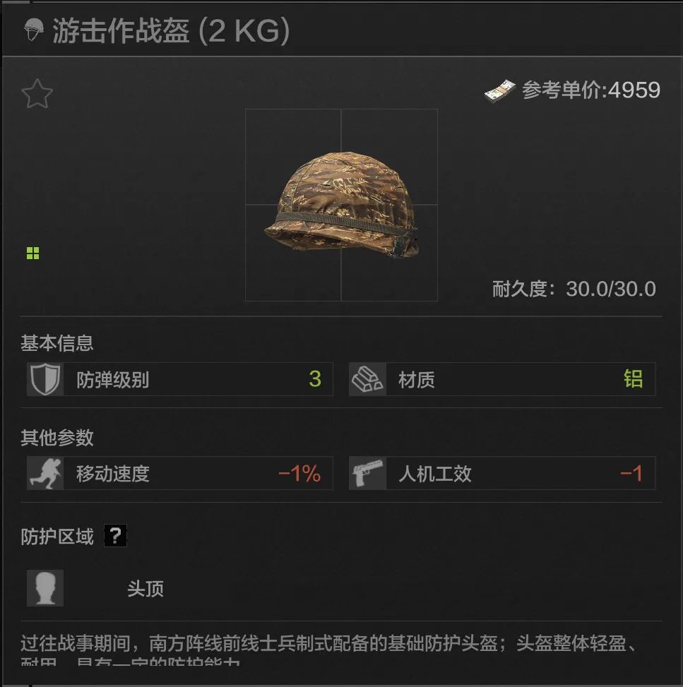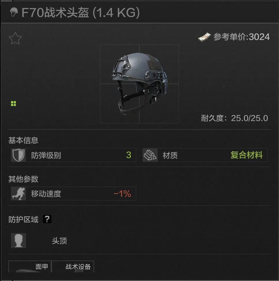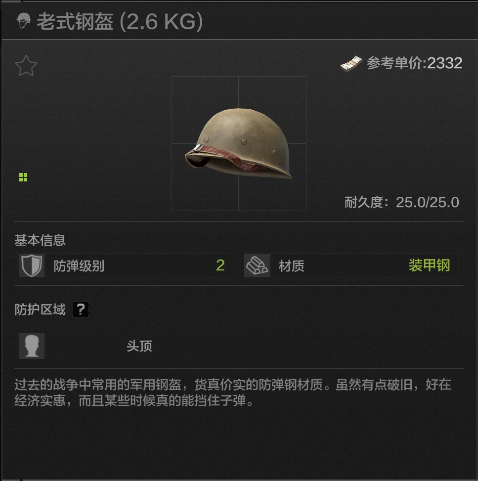 25耐久,头顶防护,材质为装甲钢,可以说是防护能力T0的材质,同时也有不错的防穿能力,有时会有奇效。