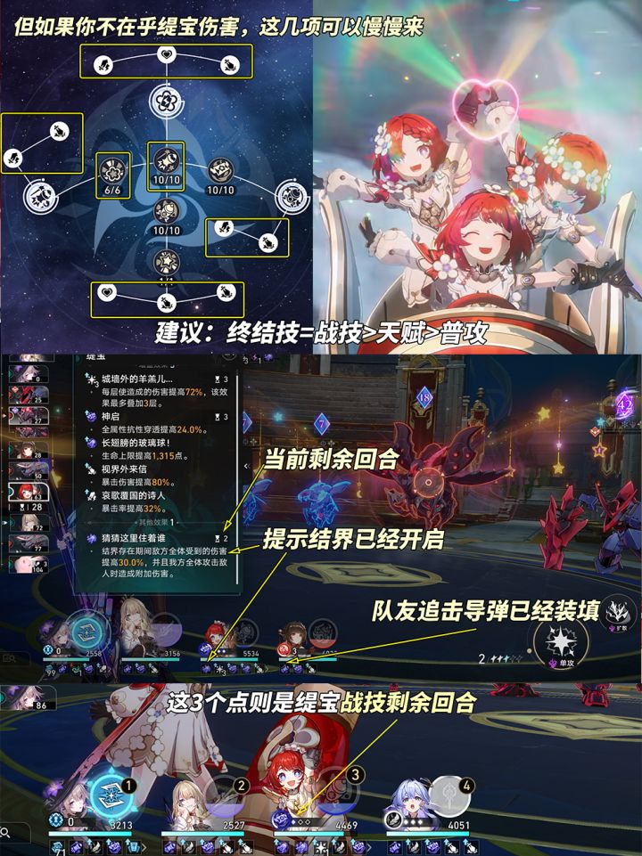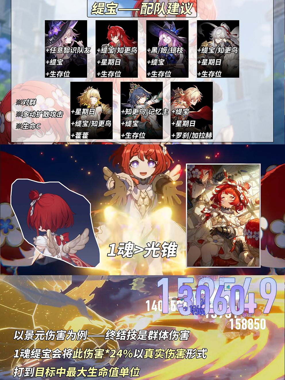 ※角色本体生命C或者自拐数值高难配辅助,那缇宝入队会不错~ 四、星魂建议 缇宝加配抽取顺序如下:角色本体=>星魂1=>光锥「如果时间是一朵花」=>囤星琼或直奔6魂。 缇宝1魂机制特殊,命中多目标时提供伤害补偿:终结技结界期间,我方攻击将对目标中生命值最高敌人额外造成‘输出总伤害*24%’真实伤害,非常利好首领召唤小弟的环境。 五、结尾 以上就是本期缇宝养成攻略解析,也欢迎各位分享一些在实战中发现的小技巧~