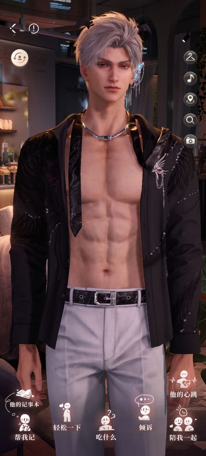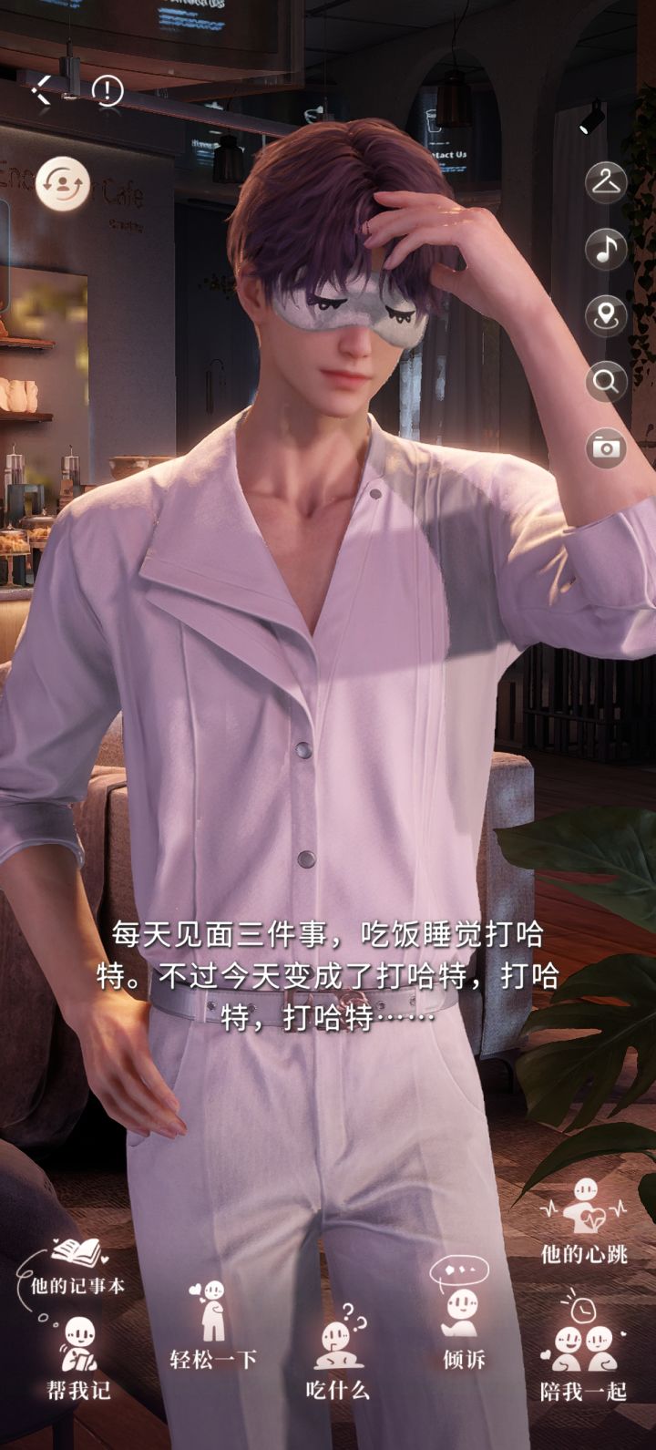 事情是这样的:我登游戏,主页是星星,然后我跟哥哥约会,回来我看星星还站着,疑惑他不睡觉吗?然后突发奇想去看其它人,结果:黎身穿黑衬衫黑墨镜,哥常服,然后我就看到鱼的装扮,疑惑:“你是要睡觉吗?”然后我再看秦,好家伙,把我平时都看不到的装饰全戴了