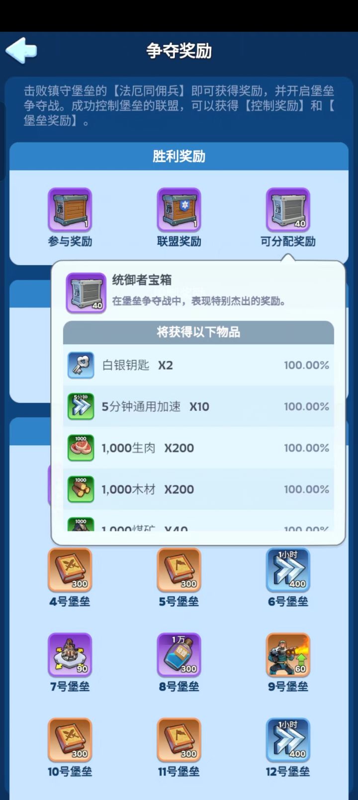 第三个奖励图三,可分配奖励,可根据本次堡垒争夺贡献度,或者参加其他活动的活跃度,由盟主和管理,负责分发奖励。