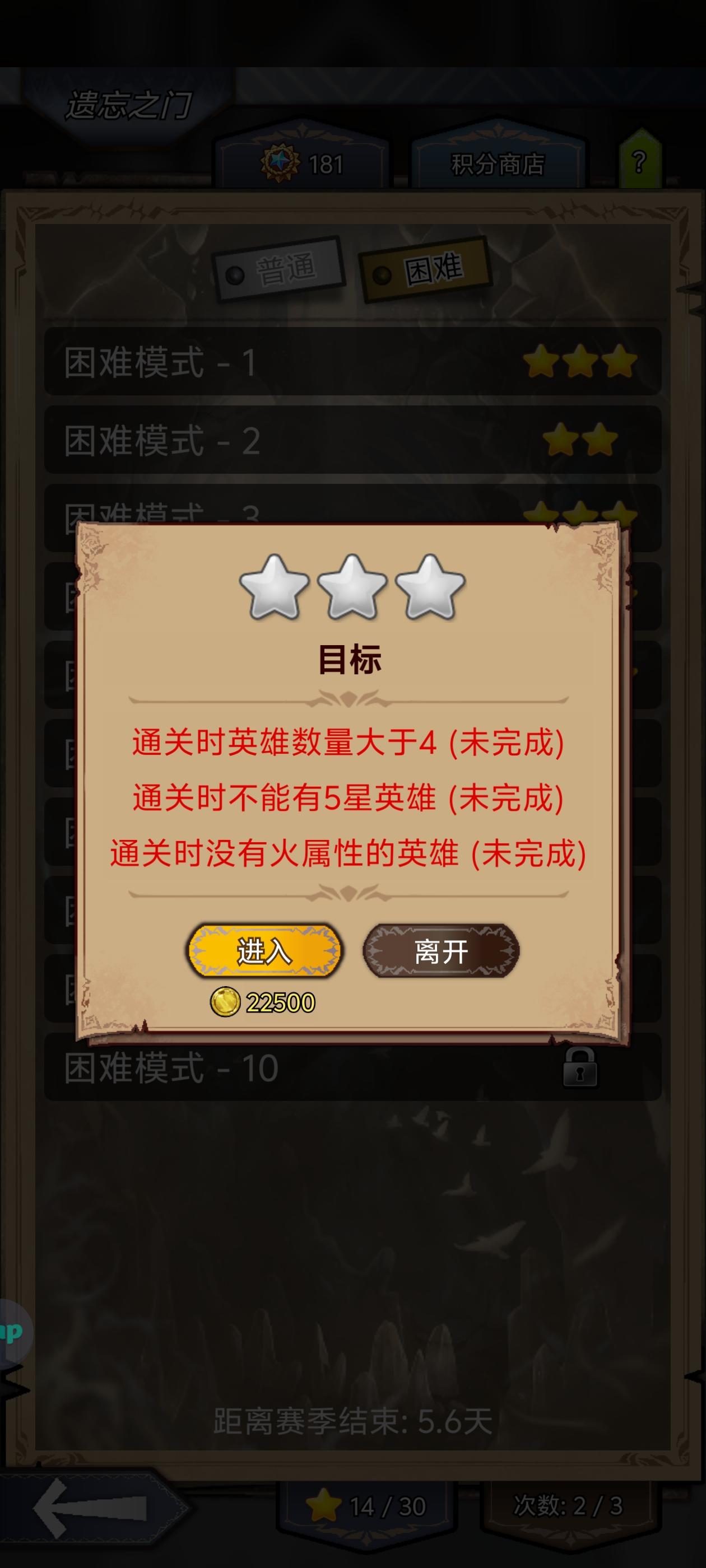 困难6,这里我第一关小怪都打不过去了,因为我武士和猎魔都没特质,这里我建议是3英雄开局,打过2个boss后再买个,最后打boss再买个,凑齐5个。
