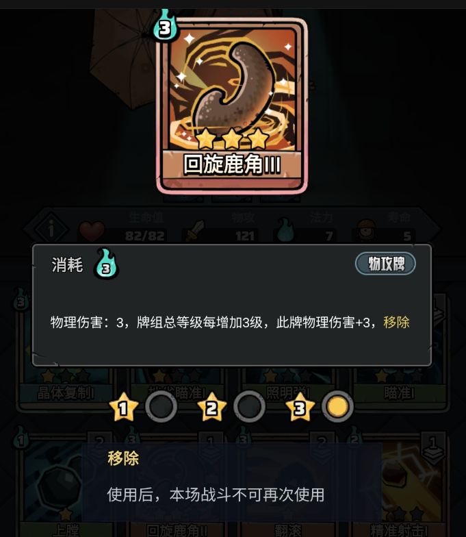 种族专属卡牌:”回旋鹿角“,这就是我为什么觉得这个角色是猎人职业天命人的原因。看属性重点”移除“、牌组总等级,这不妥妥的猎手卡组么。简单说就是你卡组每多1张3星卡,”回旋鹿角“基础伤害+3,猎人职业单卡基础伤害最高的火力压制(正常3颗弹药下)也就25基础伤害。要知道成品猎人卡组基本都20+张牌,并且这张牌是可以被”火龙蛋“复制的,可以被”猎人嗅觉“从墓地再用一遍的。