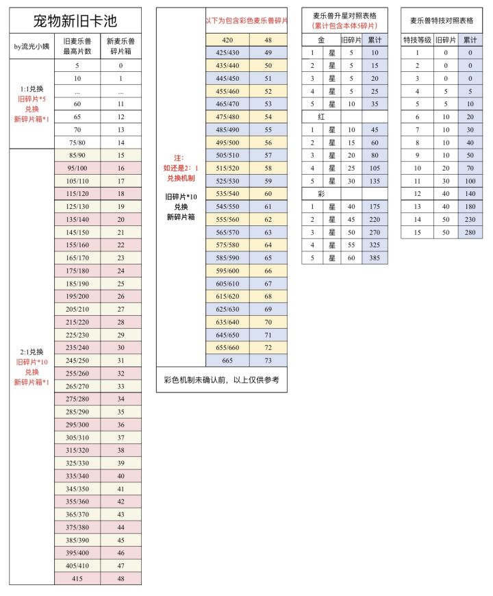 更新后加了彩色的麦乐兽所需等级碎片,但后面的兑换规则还不确定,只能还使用2:1兑换的规则列表,仅供参考