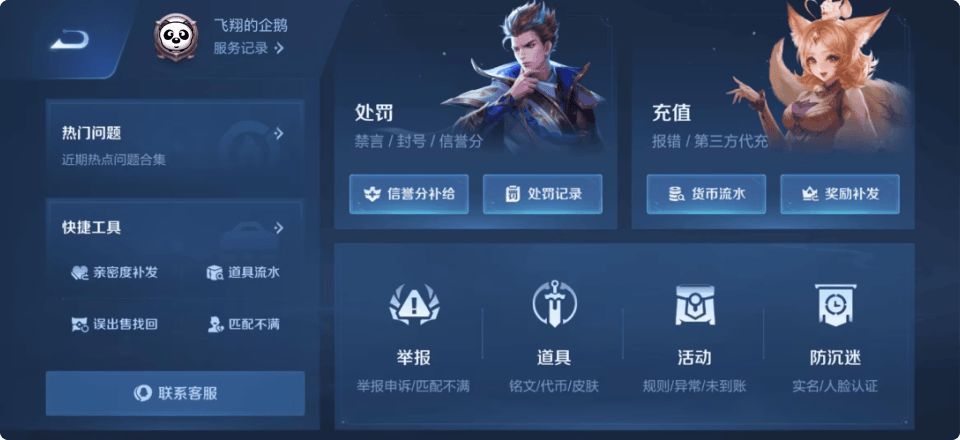 答:前往「游戏内客服专区」自助解决问题,客服入口:进入游戏 > 右上角设置 > 点击“客服”进入此页面联系客服~
