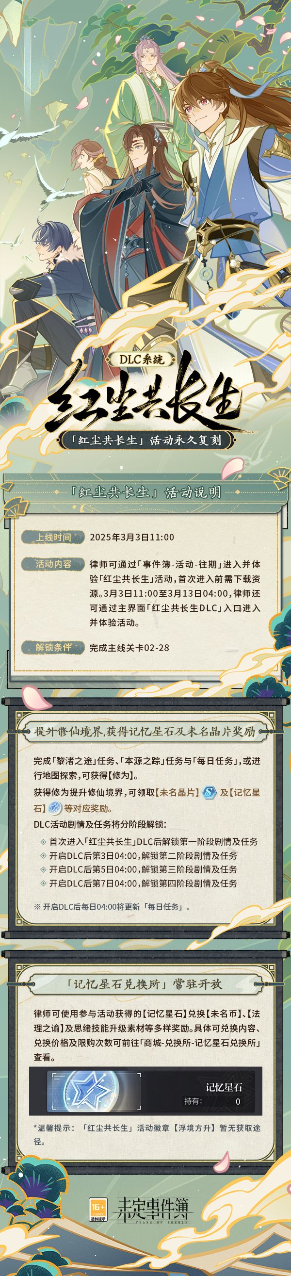 律师可通过「事件簿-活动-往期」进入并体验「红尘共长生」活动,首次进入前需下载资源。3月3日11:00至3月13日04:00,律师还可通过主界面「红尘共长生DLC」入口进入并体验活动,获取【未名晶片】及【记忆星石】等多样奖励