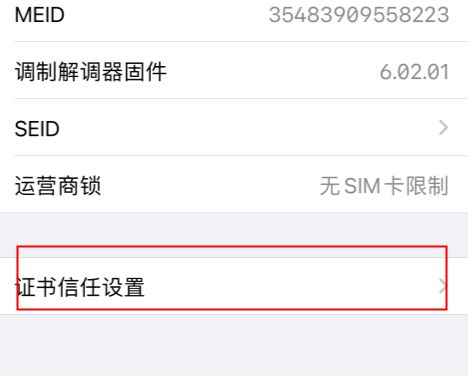 3、启用证书安装完后回到设置>通用>关于本机,滑动至底部,点击证书信任设置将刚添加的证书信任设置为打开。