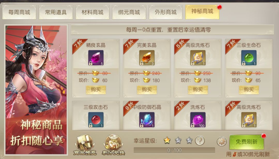 1、神秘商店每日0点刷新商品列表与商品限购数量每周一0点刷新幸运值,仙官有看上的物品一定要及时购买;