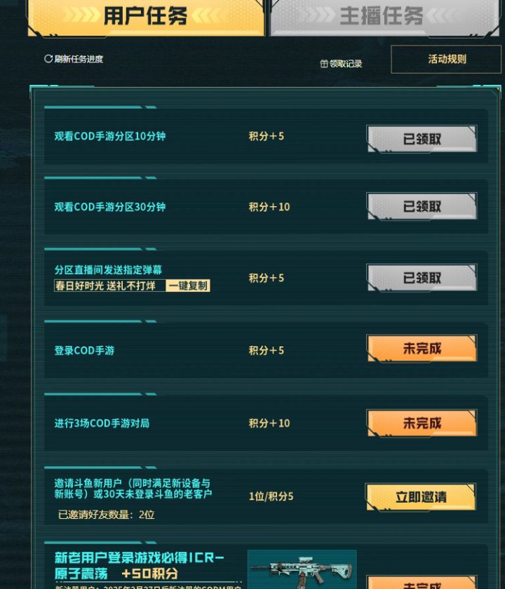 1、用户任务获取积分需要完成观看10、30分钟、登录游戏、玩3场游戏等等,全部下来每天可以领35个积分,互相邀请每一个人可以多领5分,没有上限;