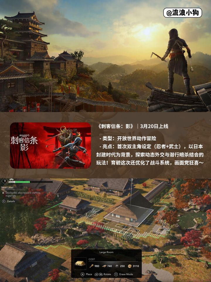 - **亮点**:首次双主角设定(忍者+武士),以日本封建时代为背景,探索动态外交与潜行暗杀结合的玩法!育碧这次还优化了战斗系统,画面党狂喜~
