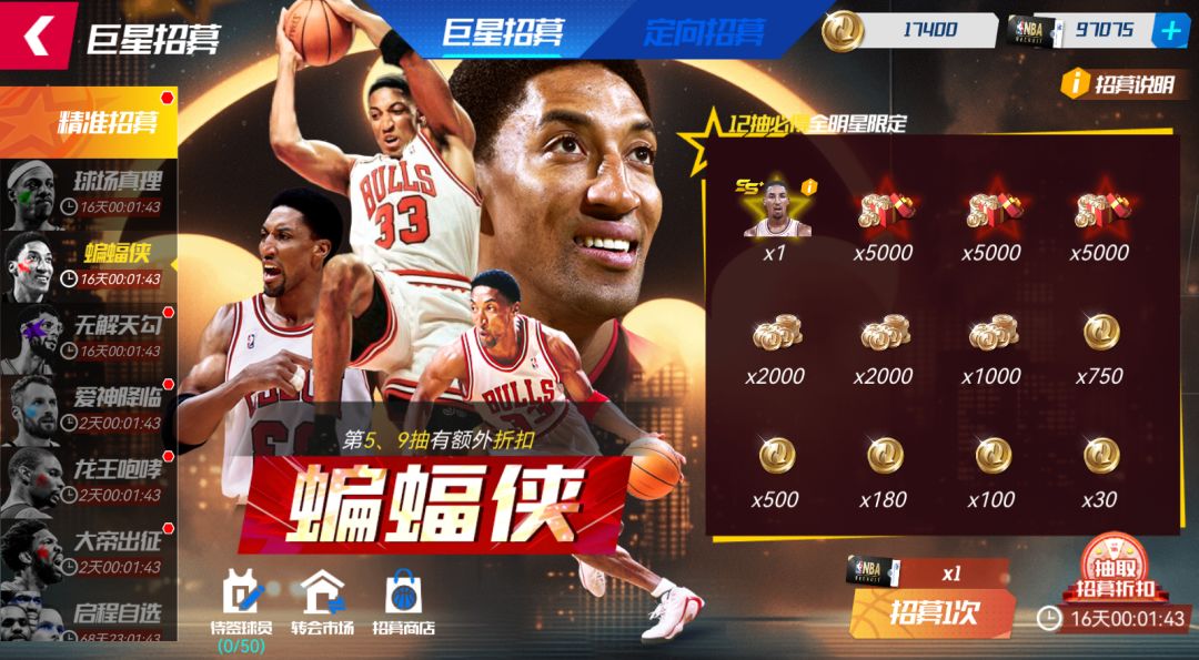 每次“抽一次”,则随机解锁一个奖励格,获取奖励格中的“全明星球员”或“转会费”。至多抽取12次,成功将全明星队皮蓬签约入队!(卡池不包含球员套装)