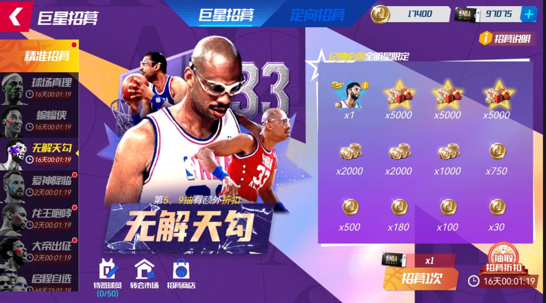 每次“抽一次”,则随机解锁一个奖励格,获取奖励格中的“全明星球员”或“转会费”。至多抽取12次,成功将全明星队贾巴尔签约入队!(卡池不包含球员套装)