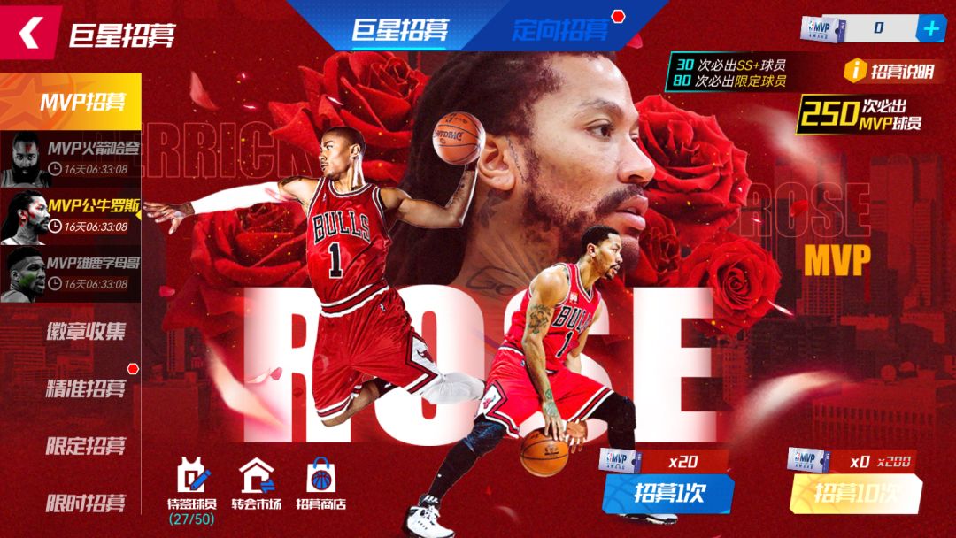 MVP卡池全员首次十连免费!至多抽取250次,成功将MVP公牛罗斯签约入队!130抽必出SS+限定球员,每30抽必出大师球员!