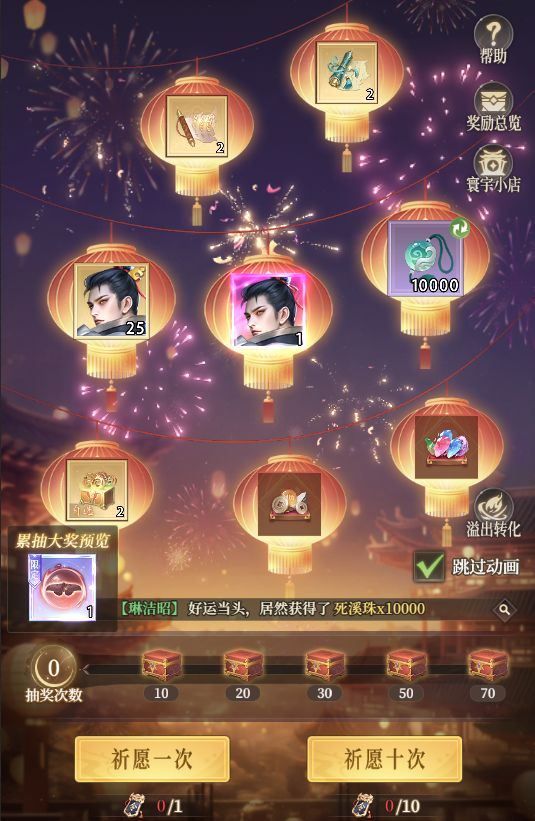 活动期间,少侠可自选奖励填充入当前卡池,再消耗活动道具进行抽取,从卡池奖励中按权重随机获得奖励。卡池中存在资源奖励,抽取到资源奖励时,会在对应的资源池中按权重获得资源。奖池累计抽奖达到指定次数即可领取宝箱奖励,活动结束后,未领取的累计次数宝箱奖励会通过邮件发放(未进行选择的自选奖励将随机发放)。