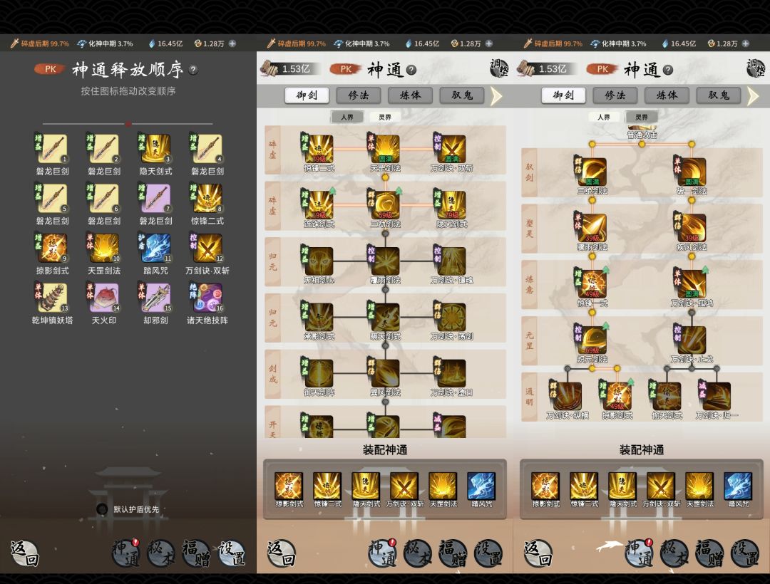 妖化推荐:鲲鹏和雷鹏,第三个随便哪个都行看自己理解,鲲鹏主要的目的是召剑扛伤或者同剑修吞剑用,雷鹏用来反伤妖化期间不能用神通,但是飞剑还是可以自动攻击,所以雷鹏放在惊锋掠影之后
