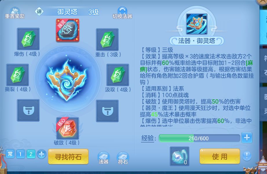 刚升到95级没多久,最近打算搞下法器。询问了下帮派里的大佬有说引雷绳的,有说御灵塔的。到底选啥,哪个比较好?顺便求大佬给配下符石。我玩的是爆炎魔王。