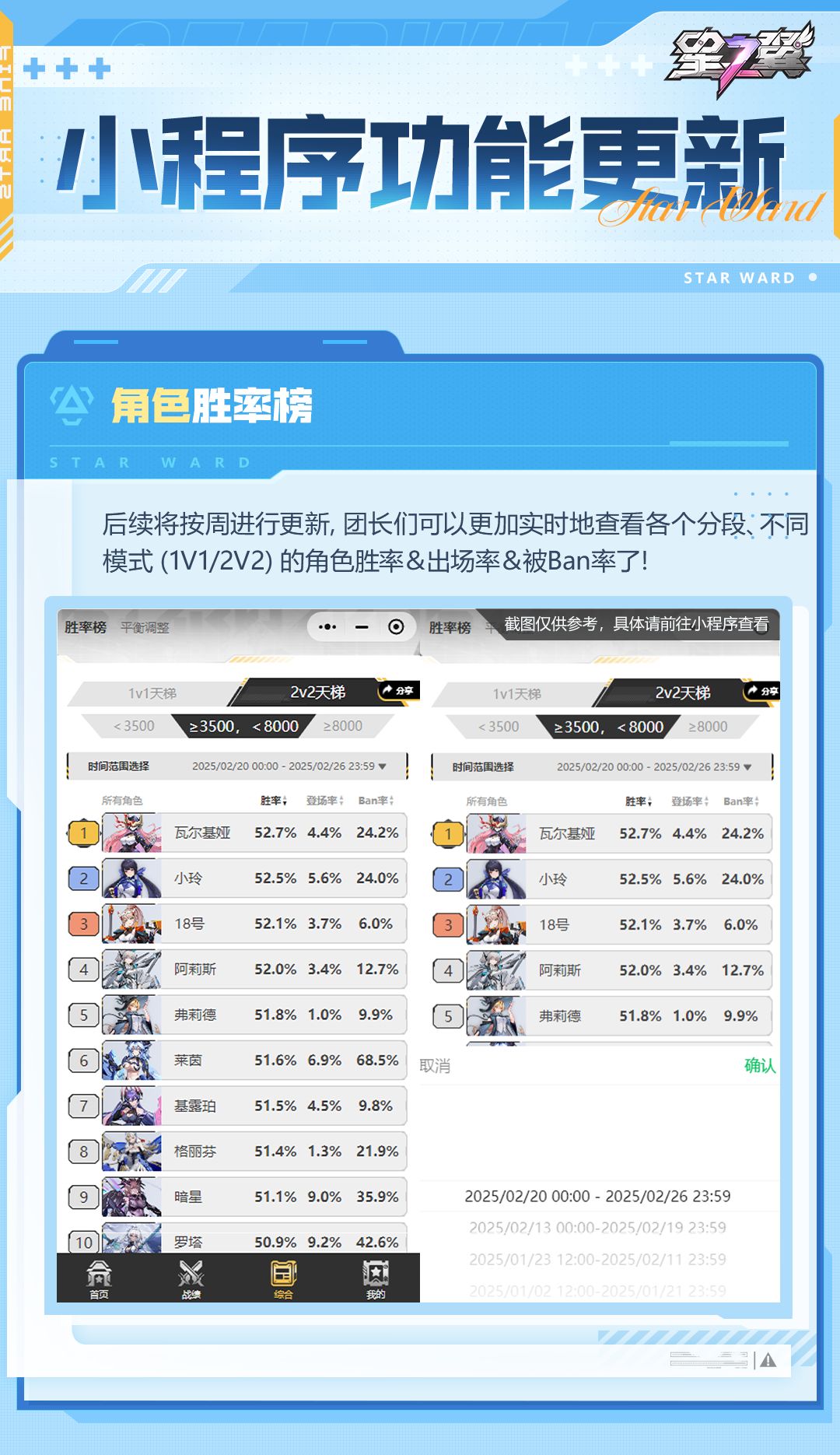 胜率榜数据后续将按周更新,团长们可以更加实时地查看各个分段、不同模式(1V1/2V2)的角色胜率&出场率&被Ban率了!