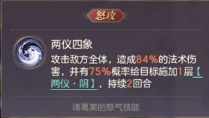 诸葛果一阶命魂效果就是给双方施加buff,对我方施加的是可以额外触发怒攻的buff,对敌方施加的是可以限制对方回怒的debuff,一眼看过去和诸葛果本体的技能组有相似之处。