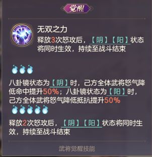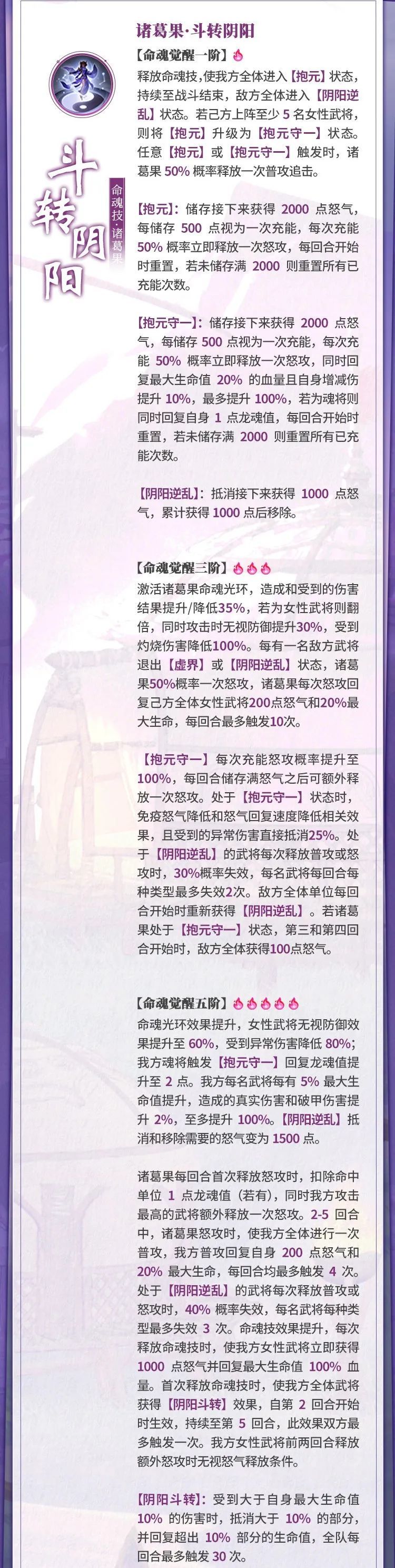 命魂觉醒后的诸葛果,使用场景限制的更加明显,对于女性队友的提升幅度完全不是男性队友可以比的,因此基本可以绑定女团使用,各类属性数值非常不错,是合格甚至中等偏上的数值模型,在机制上,除了超强的“阴阳斗转”锁血和能限制对方各类攻击的“阴阳逆乱”外,大多数机制还停留在传统的怒气体系上,但是让队友的怒攻释放方式和怒气利用方式跳脱了原有的怒气满→释放怒攻的框架,解决了女团受空城等控怒技能限制以及其他一系列问题。