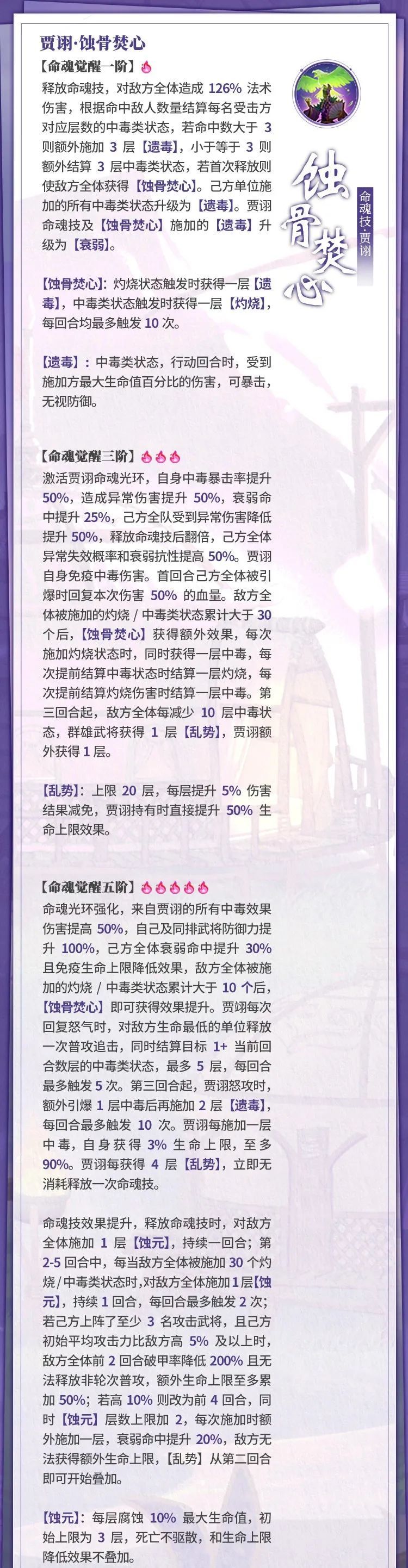 贾诩在三幻的存在感一直不强,期待中的毒体系也一次次被落下,如今已经快被遗忘了,不知高规格的命魂觉醒能否带来一个全新体系。