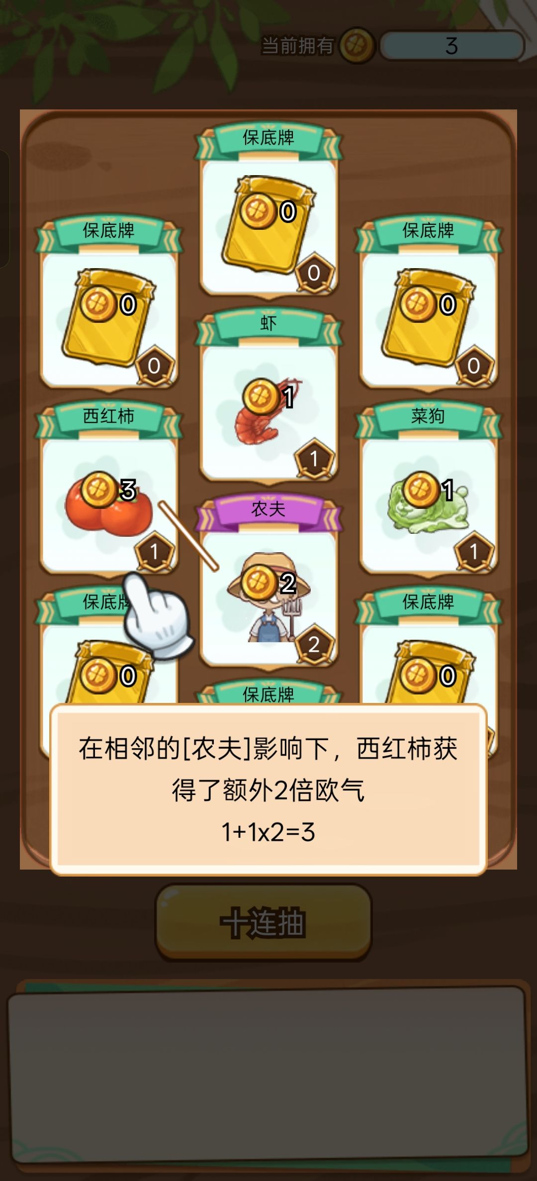 游戏特色:卡牌属性搭配,互相加持。(比如农民+蔬菜🥬可以额外获得分数)